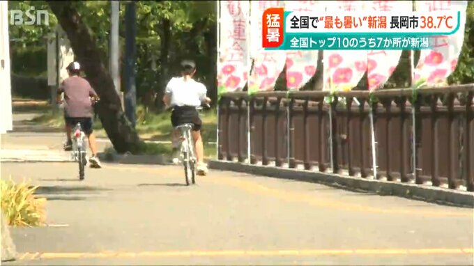 新潟県内は8日も各地で体温を超える危険な暑さとなりました。長岡市では38.7℃上越市高田では38.6℃まで気温が上がり、全国の最高気温トップ10のうち7か所を新潟が占めました。新潟県内で8日、最も暑かったのは長…