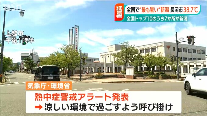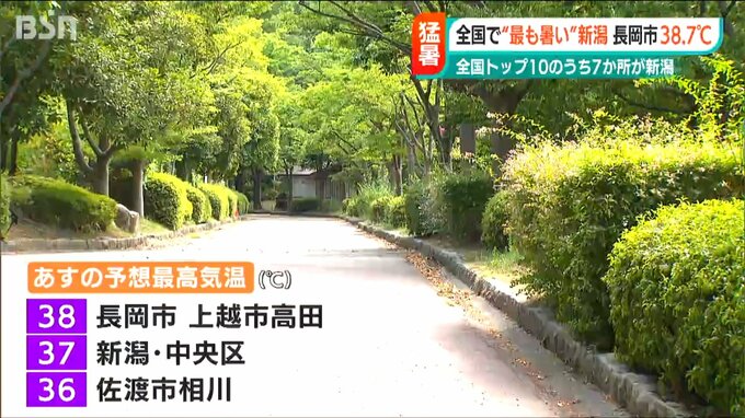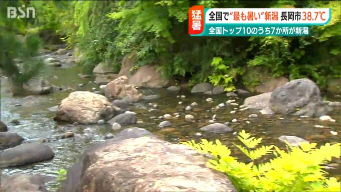 新潟県内は8日も各地で体温を超える危険な暑さとなりました。長岡市では38.7℃上越市高田では38.6℃まで気温が上がり、全国の最高気温トップ10のうち7か所を新潟が占めました。