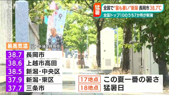 新潟県内で8日、最も暑かったのは長岡市で38.7℃。次いで上越市高田で38.6℃、新潟市中央区で38.5℃、三条市で37.7℃など県内全域で気温が上がり、28の観測地点のうち17地点でこの夏一番の暑さに、18地点で35℃以上の猛暑日となりました。