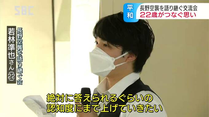 若林準也さん:                                                                             「長野出身の方なら長野空襲って何ですかって聞かれたときに絶対に答えられるぐらいの認知度にまで上げていきたい。それを後世へと語り継いでいきたい」
