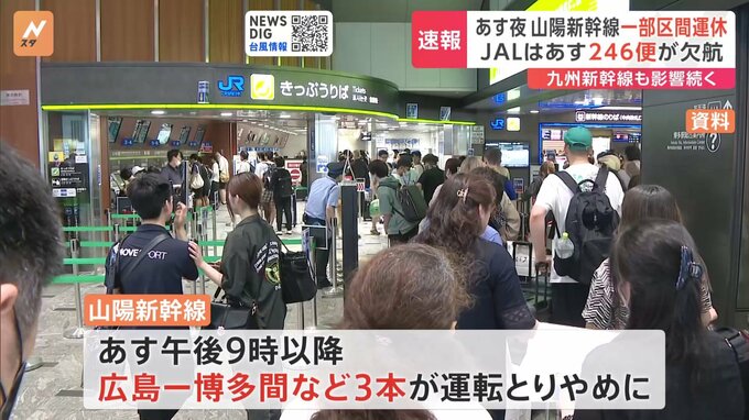 台風6号の影響で交通機関にも乱れが出ています。先ほど、あす夜の山陽新幹線で一部区間の運転とりやめが発表されました。きょう、日本航空では宮崎空港や鹿児島空港を発着する便を中心に132便が欠航しています。そ…