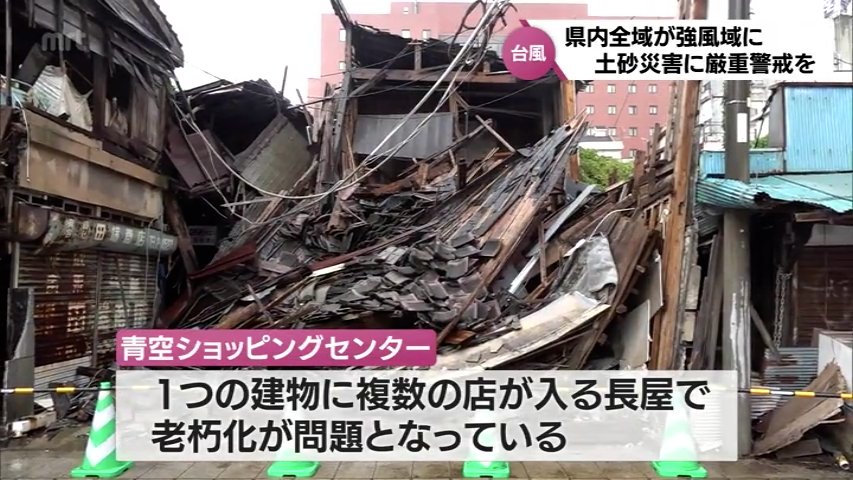 終戦後から栄え始めた商店街「青空ショッピングセンター」は、1つの建物に複数の店が入る長屋で老朽化が問題となっていますが、台風の接近に伴うさらなる倒壊が懸念されています。
