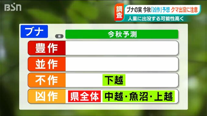 この秋はクマの出没に要注意です。クマの餌となるブナの実が多くなっているかどうか調査が行われ、この秋は「凶作となる見込み」と新潟県が発表しました。
