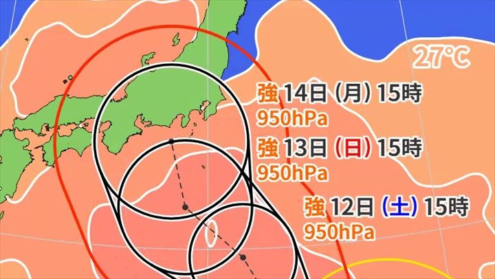 ヨーロッパの中期予報センターの方を見ると、今度は東海から近畿に行く予想となっています。つまり、まだそれだけぶれ幅があるということなので、まだまだ何とも言えない状況です。