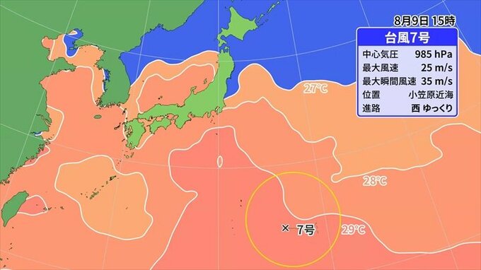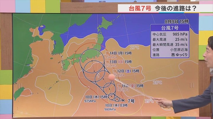 ではどこを進むのか進路を見ていくと、丁度この29℃のラインを上がってくる予想なんです。つまり、この気圧を見ていただいても、数字が少なくなるほど発達していることを表しています。で、どこに進むのかは正直見えません。