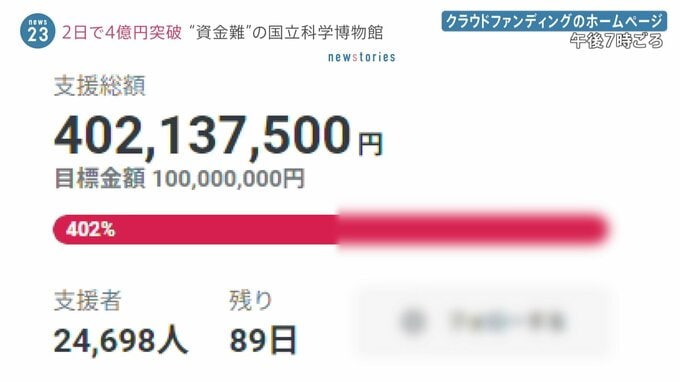 東京・上野の国立科学博物館のクラウドファンディングが4億円を突破しました。国立科学博物館はきのうから、光熱費の高騰や入館者数の減少などによる資金難を解消するため、インターネットで1億円を目標にしたクラ…