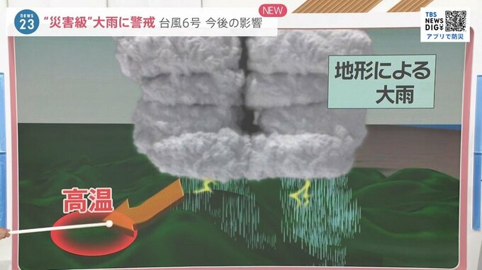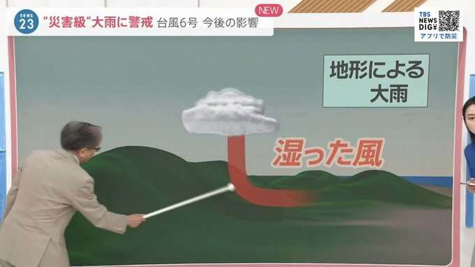 台風6号はやっと動き出した、という感じですね。それでも時速は約10キロで、九州南部の一部が暴風域に入りました。この後、九州の西の海上を北へ進んで、朝鮮半島方面、台風に向かって東風が吹くので、この風が吹くところでは特に大雨になりやすいです。