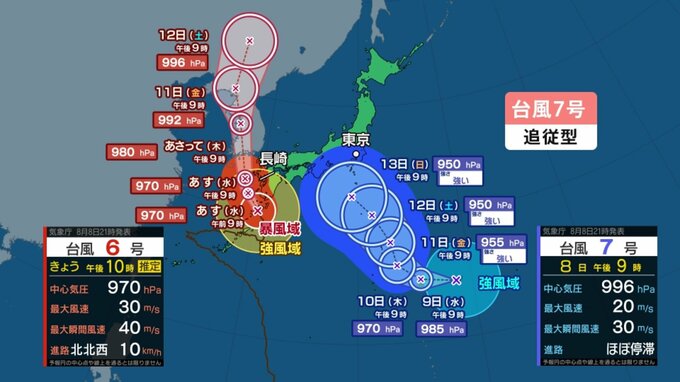 一方、今後は台風7号も心配です。台風6号が抜けた後に、7号はその後ろを追いかけるような形を通りそうです。こういうタイプのことを「追従型」と言います。ですから昨日の予想よりもちょっと6号によって引っ張られるという感じで進路がずれてきてるんですね。