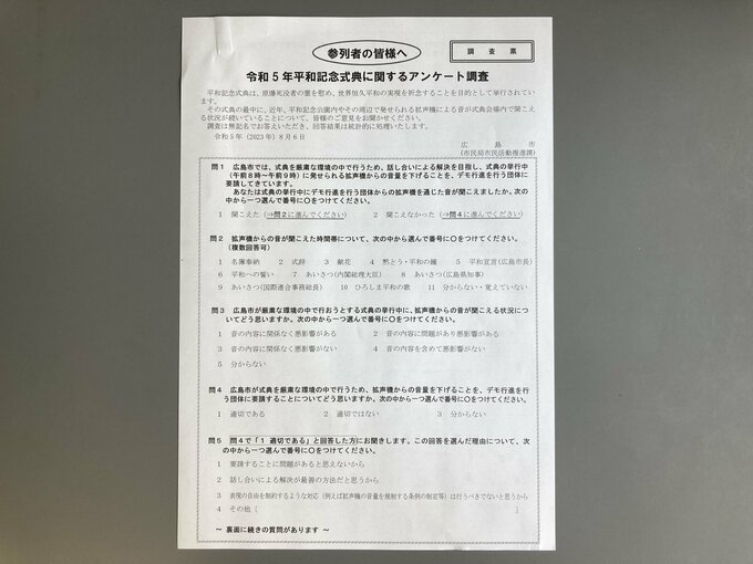 6日、市は式典参列者に対してアンケート調査を実施しました。内容は「式典中に拡声器の声が聞こえたか」「拡声器の音量を下げるよう団体に要請することは適切か」など騒音に関するものです。