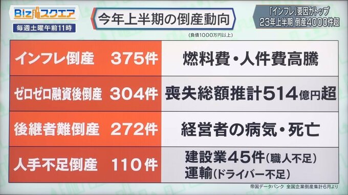 内訳はインフレ倒産が375件、ゼロゼロ融資後倒産が304件、後継者難倒産が272件、人手不足倒産が110件となっている。