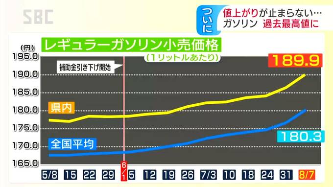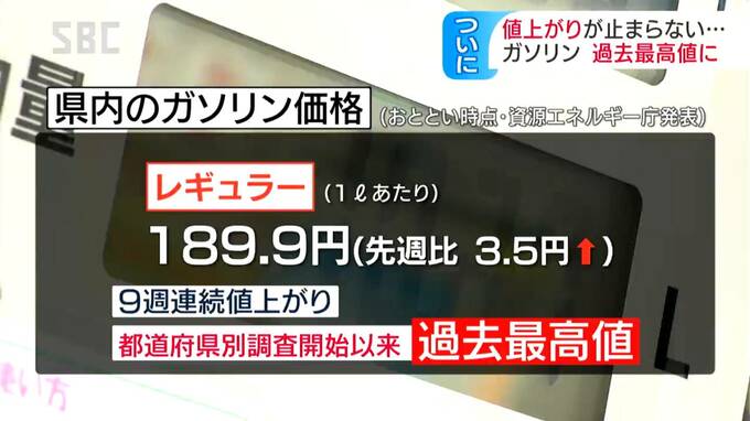 資源エネルギー庁によりますと、7日時点の県内のレギュラーガソリンの平均小売価格は、先週より3.5円高い189.9円で、都道府県別の調査が始まった2004年以降、最高値を更新しました。