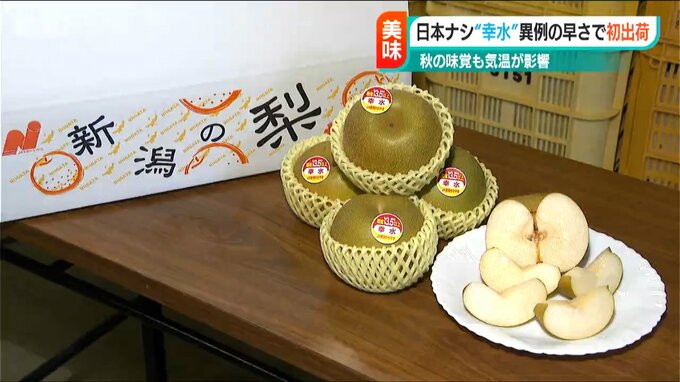 暑い日が続く中、“秋の味覚”が異例の早さで出荷です。日本ナシの「幸水」が高温で開花が早まったということで、例年より一週間ほど早く出荷が始まりました。太陽が降り注ぐ中、収穫されているのが早生品種のナシ…