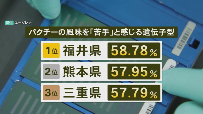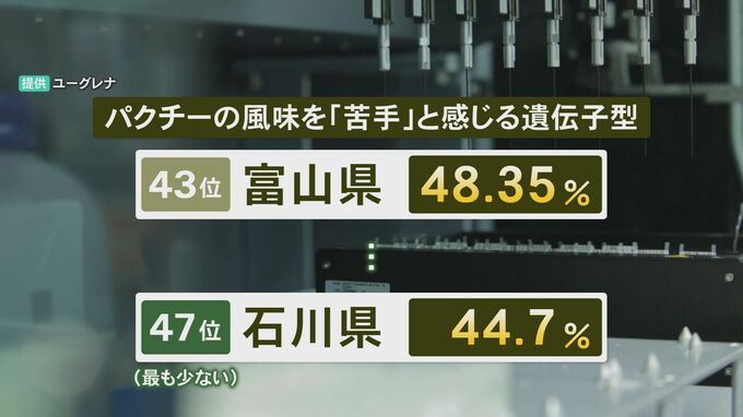 遺伝子の解析の結果、パクチーの風味を苦手と感じる遺伝子型が全国で最も少ないのは石川県で、全体の44.7%。