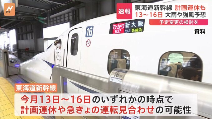 台風7号の影響で東海道新幹線に計画運休の可能性が出てきました。JR東海は、台風7号の影響で大雨や強風が予想されているとして、今月13日から16日のいずれかの時点で、東海道新幹線の計画運休や急きょの運転見合わ…