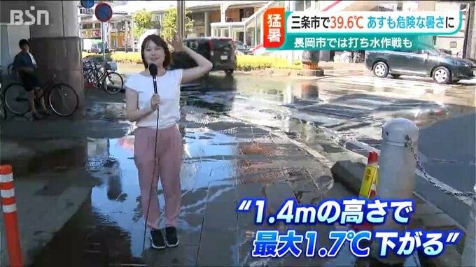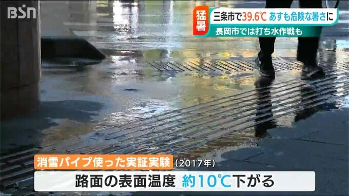 長岡市によりますと、2017年に行った実証実験ではこうして水をまくことで、路面の表面温度が10℃ほど下がりました。