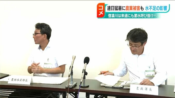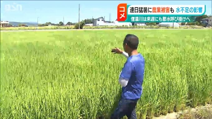 北陸地方整備局によりますと、農業用水を多く供給している信濃川も水量が平年の半分ほどに減っています。このまま雨が降らないと来週にも十分な取水量を確保できる「正常流量」を下回る可能性があり、下回った場合は関係機関に節水を呼びかけるとしています。