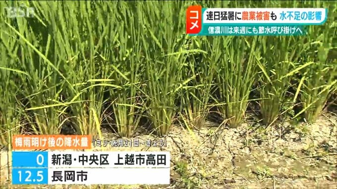 新潟地方気象台によりますと、梅雨明けが発表された7月21日から8月10日までに降った雨の量は、新潟市中央区で0ミリ、長岡市で12.5ミリなどとなっていて、新潟県内では水不足が懸念されています。
