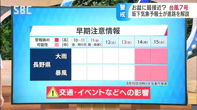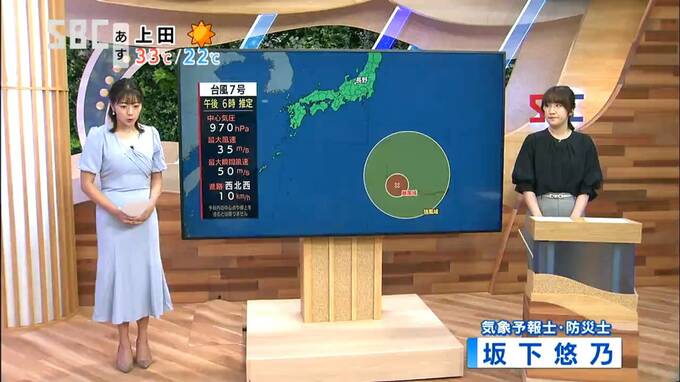 お盆の前後に長野県にも影響を及ぼす可能性がある台風7号の今後の動きについて、SBCニュースワイドの坂下悠乃気象予報士が解説します。