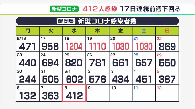 静岡県内では6月8日、新たに412人が新型コロナウイルスに感染したことが分かりました。1日あたりの新規感染者数は、17日連続で前の週を同じ曜日を下回っています。412人の感染者を自治体別にみますと、浜松市で106…