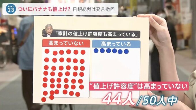 商店街で値上げの許容度が高まっているのか聞いたところ、50人中44人が高まっていないと答えました。「高くても買わざるを得ない」のが実情のようです