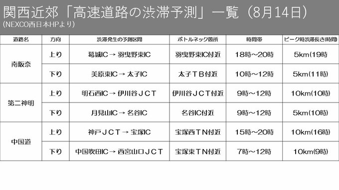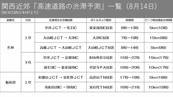 【お盆の渋滞】名神22km 山陽道21km 新名神21km 3連休の高速道路は帰省と行楽地へ向かう車列 毎日放送 2023年8月11日(金) 11:32 経済 暮らし・マネー 3連休の渋滞予測 Uターンのピークはいつ(日付・路線別)13日 3連休の渋滞予測 Uターンのピークはいつ(日付・路線別)14日
