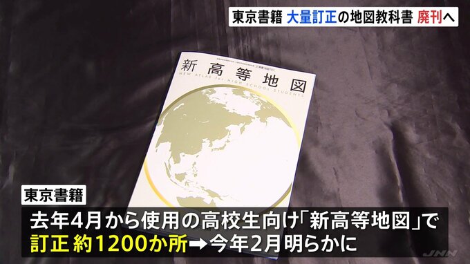 教科書出版大手の「東京書籍」が販売した地図教科書におよそ1200か所の訂正があった問題で、「東京書籍」はこの地図教科書を2026年度以降「廃刊」にすると発表しました。東京書籍では、去年4月から使われていた高…