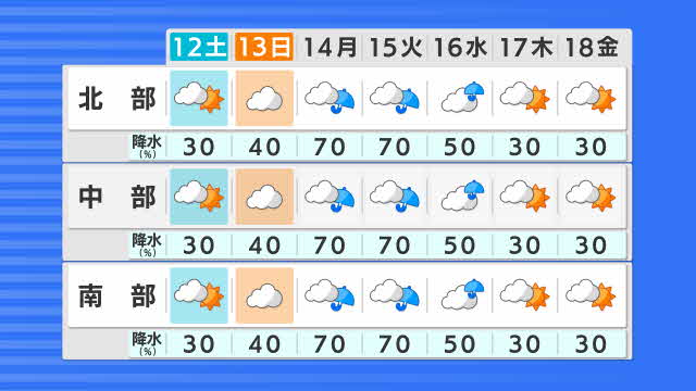 また13日の午前9時には、父島の北西およそ400キロに位置し、中心の気圧は935ヘクトパスカルを維持、中心付近の最大風速は45メートル、最大瞬間風速は65メートルが予想されます。