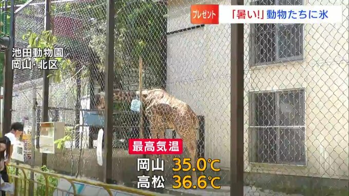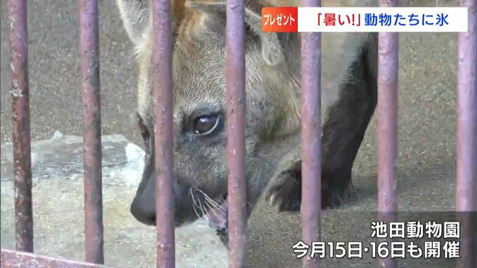 6年ぶりの開催で、岡山市内の製氷会社が重さ約100キロ分の氷を寄付。飼育員が、ライオンやブチハイエナなど4種類の動物に氷をプレゼントしていきました。