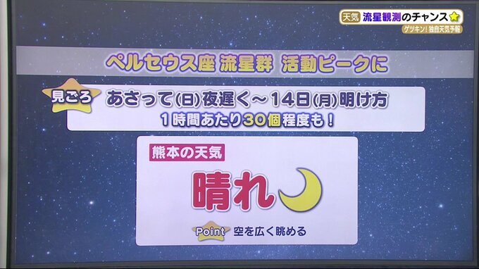 8月13日(日)夜遅く~14日(月)明け方にかけてが見ごろで、明け方3時から4時頃が最も多くなりそうです。