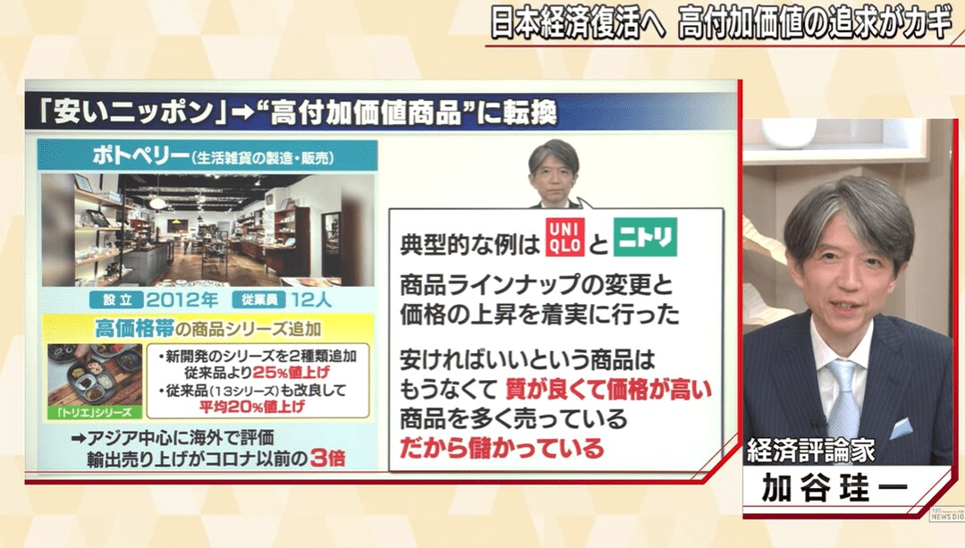 「インフレ下に薄利多売は成立しなくなる。コストが上がった分付加価値をつけて高い値段で売る以外生き残れない。…ユニクロやニトリは知らず知らずのうちにその変換を進めているんですね。イメージ的には、ユニクロは1000円台の服を売っていると思っている、特に年配の方は…。でも今、そんな値段のものはあまりありません。ニトリも安い物ばかりと思われがちですが、店舗に行くと結構高い商品も扱っているんです。…インフレに対応した経営ってこういうものなんだってわかります」