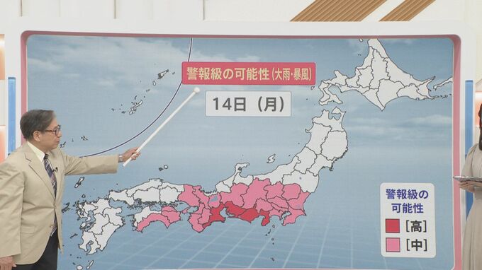 それによると14日は三重県、愛知県、静岡県は特に高い。そしてもう少し西側の近畿地方を含めて警報の可能性があります。さらに15日になると岐阜県の方まで広がって、北陸や福島でも南風の吹き返しなどで暴風警報が発表される可能性があるということになります。