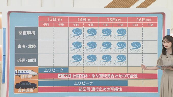 各社の対応です。JR東海・東海道新幹線は13日から16日の間に▼計画運休や▼急な運転の見合わせの可能性があると発表しています。高速道路も▼一部区間通行止めの可能性があるということです。