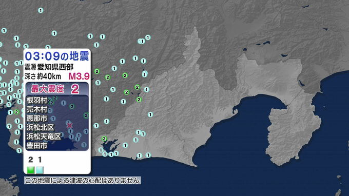 【地震情報】浜松市北区と天竜区で震度2を観測 愛知県西部の地震 津波の心配なし 静岡放送 2023年8月12日(土) 07:02 国内 3時09分頃、地震がありました。この地震による津波の心配はありません。震源は愛知県西部 深さは約40km規模はM3.9 最大震度は2 県内の震度図 震度2 浜松北区 浜松天竜区震度1 浜松中区 浜松西区 浜松浜北区 磐田市震度1 湖西市