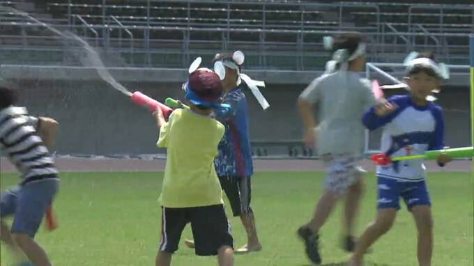 日ごろあまり入ることのできないシティライトスタジアムの天然芝を小学生に楽しんでもらおうと水鉄砲で遊ぶイベントが、きょう(12日)行われました。(参加者)「がんばるぞー!」今回で3回目となる「ももたろう…