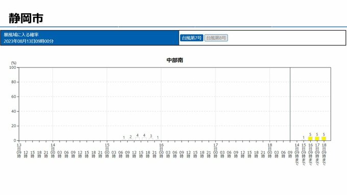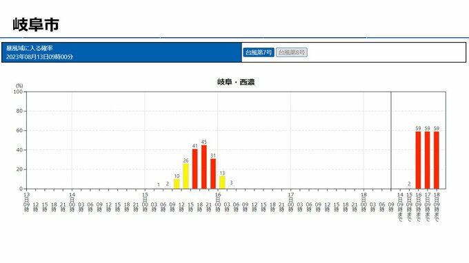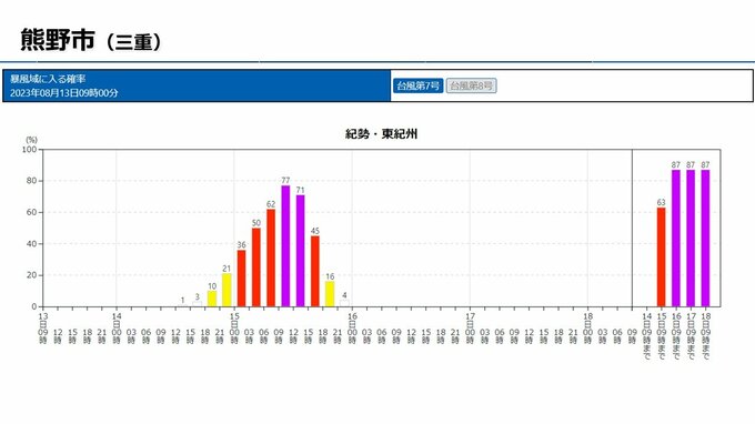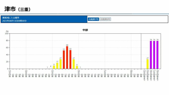 いつ・どこが暴風域に? 台風7号 “最接近”いつ? 15日に本州 “縦断”お盆Uターン影響大 気象庁進路予想 中国放送 2023年8月13日(日) 11:53 国内 天気 東海地方(13日午前9時発表) 東海地方では西部ほど確率が高くなっています。中でも紀伊半島南部に位置する三重県南部では確率がとても高い紫色の地域もあります。 最接近は三重県では15日の昼前から昼過ぎにかけて、その他は15日午後となっています。