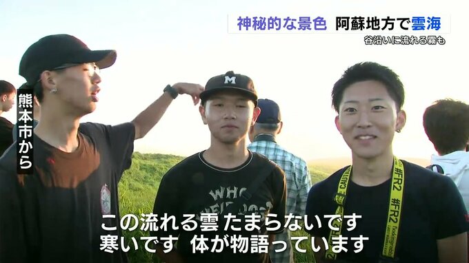 午前5時半、標高およそ900メートルの大観峰(だんかんぼう)では、雲海と外輪山(がいりんざん)の谷沿いに霧が流れる神秘的な景色が見られました。訪れた人は半袖では肌寒いくらいの風が吹くなか景色を楽しんでいました。