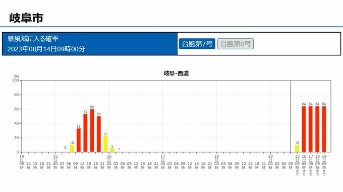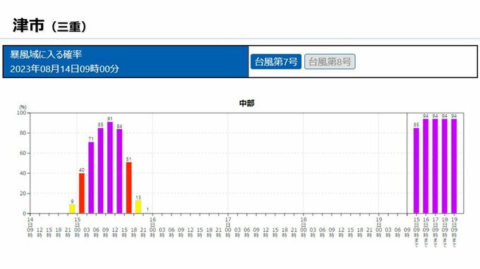 台風7号 あす 暴風域に入る確率 大阪など近畿は広く“90%以上” 最接近&各地の確率は 気象庁進路予想 中国放送 2023年8月14日(月) 11:33 国内 天気 東海地方(14日午前9時発表) 東海地方では西部ほど確率が高くなっています。中でも三重県は90%以上の確率と非常に高い確率です。 最接近は三重県では15日の未明から朝にかけて、愛知県や岐阜県では午後と予想されています。