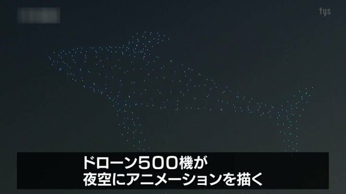 関門海峡の夜空にドローン500機が下関を象徴する、クジラやイルカなどさまざまなアニメーションを描きました。花火の打ち上げ前に事前告知なしのサプライズイベントとして初めて行われました。