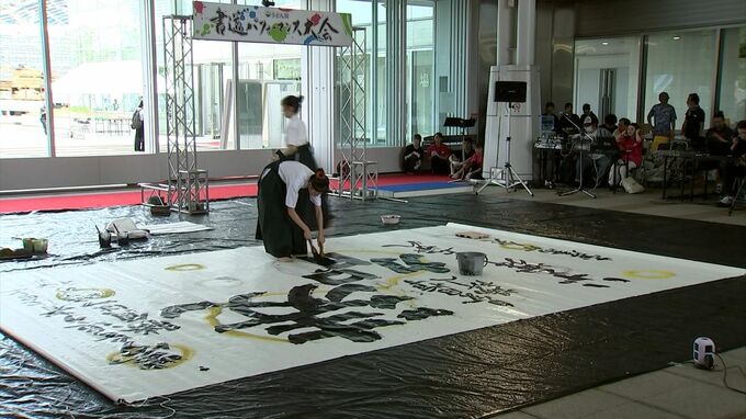 大胆な筆遣いと、音楽に合わせた流れるようなパフォーマンス。縦4メートル・横6メートルの巨大な紙に、6分間で作品を作り上げる高校生の書道パフォーマンスです。