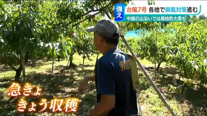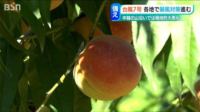 台風への備えは農園でも。これから出荷のピークとなる「黄金桃」を栽培している佐渡市新穂潟上の農園です。