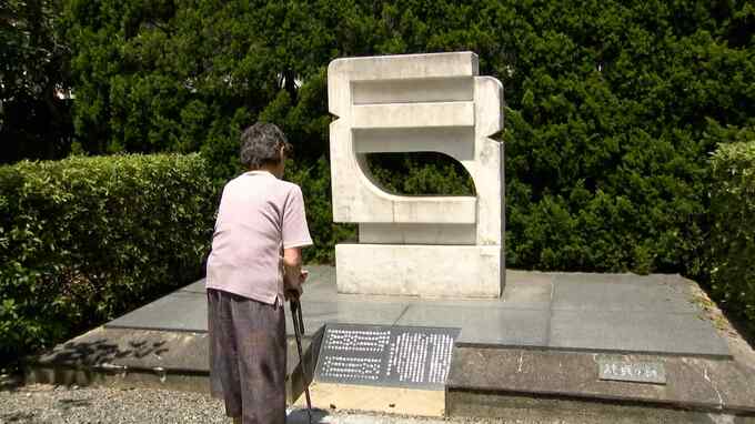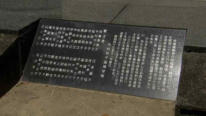 杉村さんが通っていた中村高等女学校の生徒は、当時、北九州市の小倉陸軍造兵廠だけでなく、各地の兵器工場に動員されていました。終戦前日の8月14日、山口県内の工場が狙われ、働いていた女学生33人も犠牲になったのです。数字の3が抱き合うような形をした慰霊碑には、亡くなった女学生の名前が刻まれています。その中には杉村さんの同級生も含まれていました。