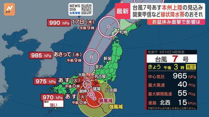 強い台風7号があす、本州に上陸する見込みです。気象庁は関東甲信などにも線状降水帯が発生する可能性があるとしていて、広い範囲に厳重な警戒を呼びかけています。きょう午前、東京都心など各地を襲った急な大雨…