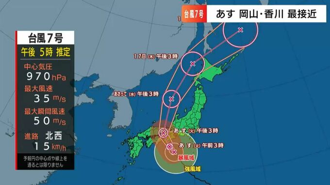 強い台風7号は、日本の南の海上を1時間に約15キロの速さで北上していて、あす午後にも岡山・香川に最も接近する見込みです。