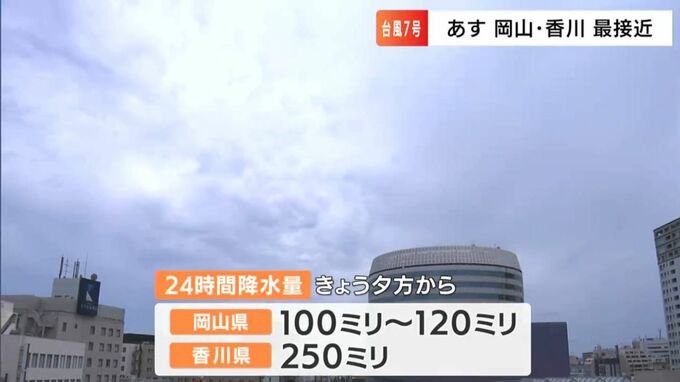 きょう夕方からの24時間降水量は、岡山県で100ミリから120ミリ、香川県で250ミリと予想されていて、気象庁は中国・四国地方に線状降水帯の発生予測情報を出すなど激しい雨や風に警戒が必要です。
