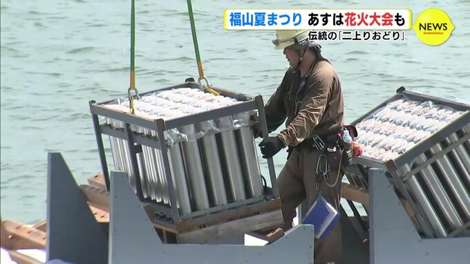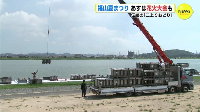 福山市の芦田川では、13日、花火の設置作業が行われました。10トントラック5台で運ばれてきた花火がクレーンに釣り上げられて台船に乗せられていきます。