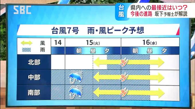 15日に近畿から東海にかけて上陸するおそれがある台風7号の今後の動きについて、SBCニュースワイドの坂下悠乃気象予報士が解説します。