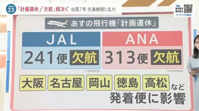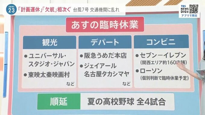 空の便は、大阪や名古屋を発着する便を中心に日本航空が241便、全日空は313便の欠航が決まっています。さらに、ユニバーサル・スタジオ・ジャパンなどの観光地、デパートやコンビニなども、15日は臨時休業を決めていますので、お出かけの際はぜひ確認するようにお願いいたします。