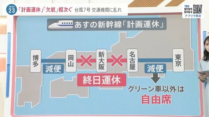 東海道、山陽新幹線は、名古屋―岡山間は終日運休となっています。そして、東京―名古屋間、岡山―博多間も減便され、東京―名古屋間の場合はグリーン車以外は自由席になりますので、しっかり確認をしてください。
