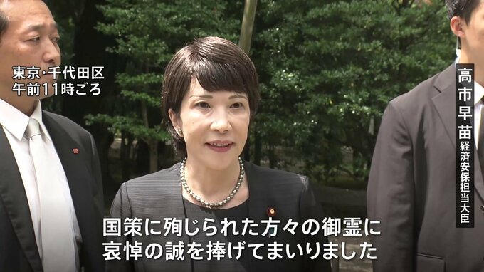 靖国神社では、現職閣僚の高市経済安全保障担当大臣や自民党の萩生田政調会長が相次いで参拝しました。岸田総理は参拝を見送り、玉串料を納めています。高市早苗 経済安保担当大臣「国策に殉じられた方々の御霊に…