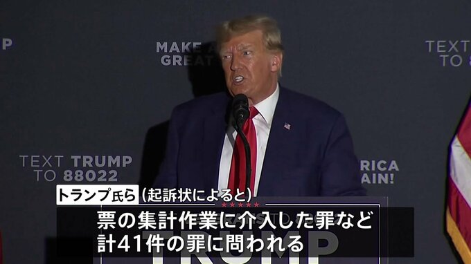 アメリカのトランプ前大統領が2020年の大統領選挙で南部ジョージア州の票の集計に介入した罪などで起訴されました。起訴されるのは、これで4度目です。ジョージア州の大陪審は14日、トランプ前大統領や元側近らあ…